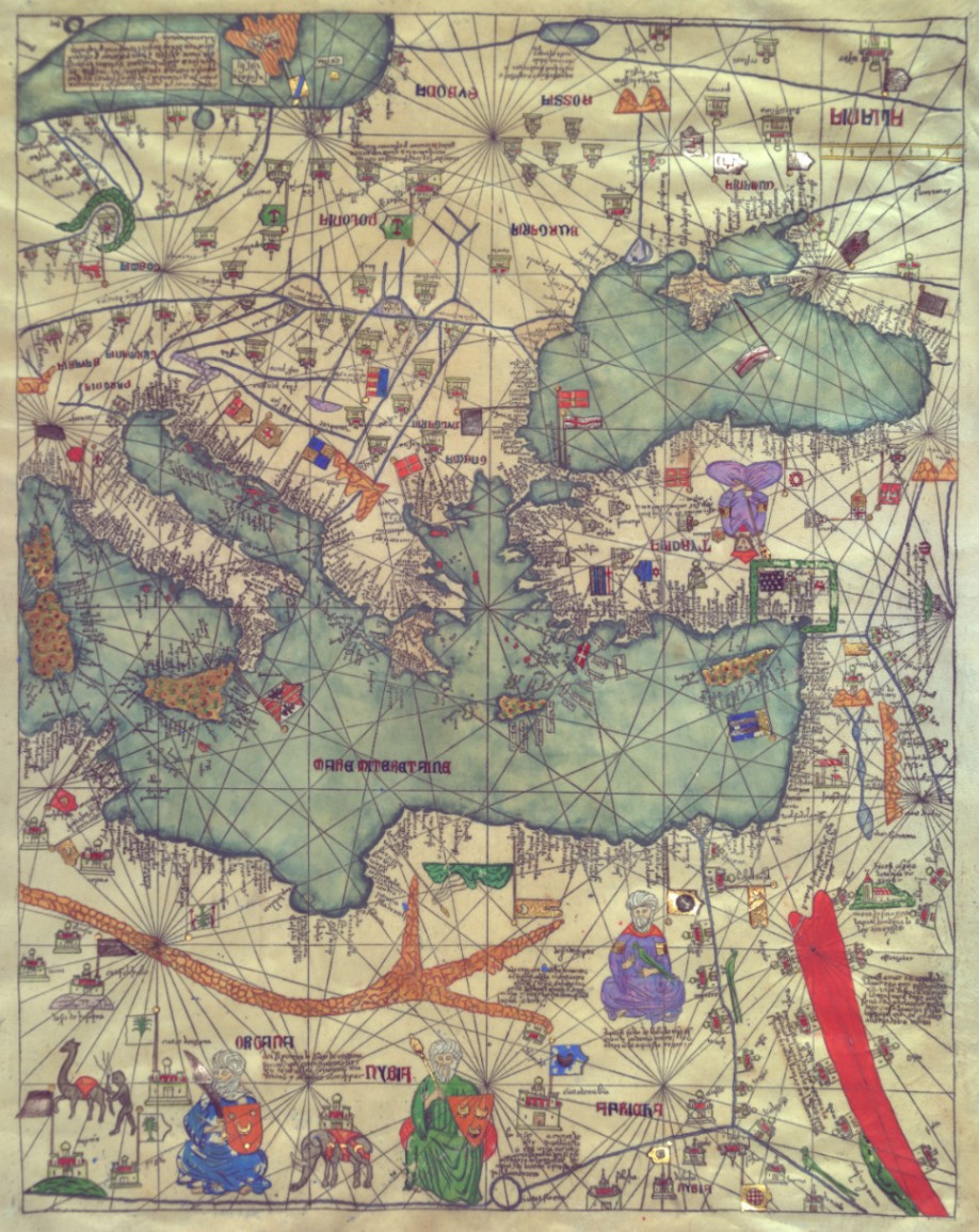 Одна из карт работы еврейского картографа Элиши бен Авраама Крескеса, 1375, Пальма де Мальорка. Карты работы его и сына, Йехуды, оставались лучшими вплоть до начала эпохи Великих Географических Открытий.